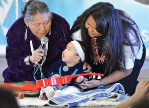 THIRD FROM TOP: Jason Begaye Jr., 7 months, watches his grandmother Wanda Begay sing to him as his mother Natasha Begay looks on Monday in Window Rock.