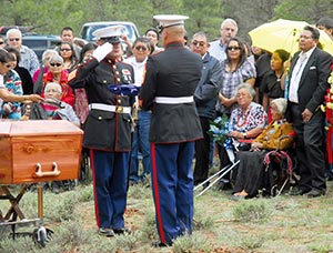 BOTTOM: The Marine honor guard salutes the flag-draped casket of Navajo Code Talker John Brown Jr. Tuesday in Chinle. He was buried at a family burial plot in Crystal, N.M.