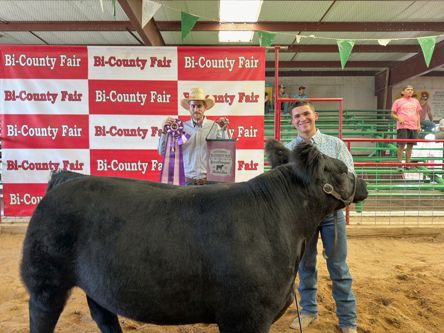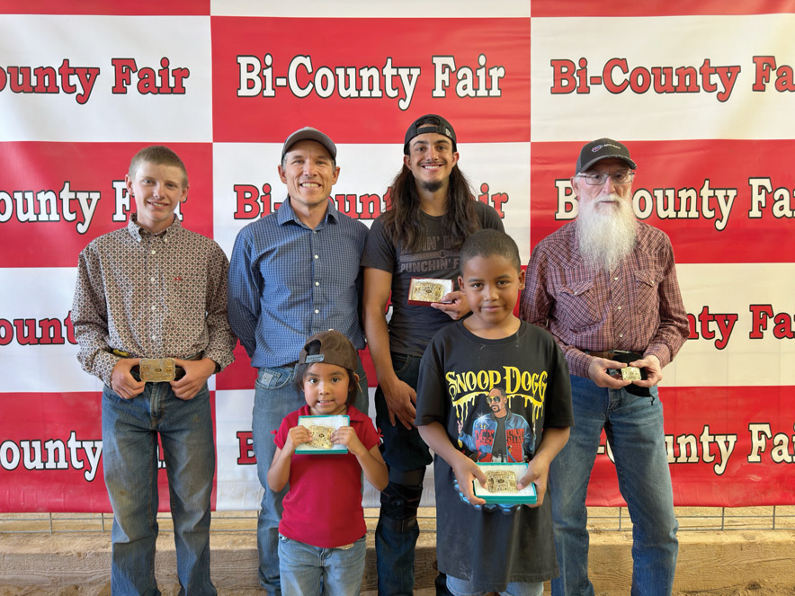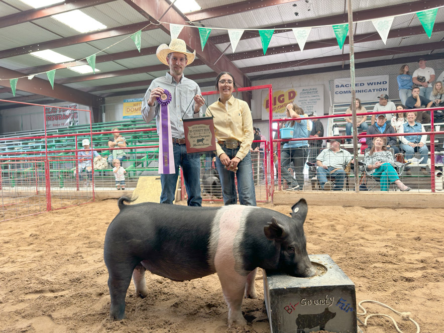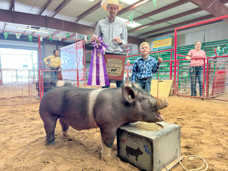 Kartch Cash, right, is awarded for exhibiting the grand champion market swine during the 55th Annual Bi-County Fair in Prewitt, N.M., on Aug. 31.