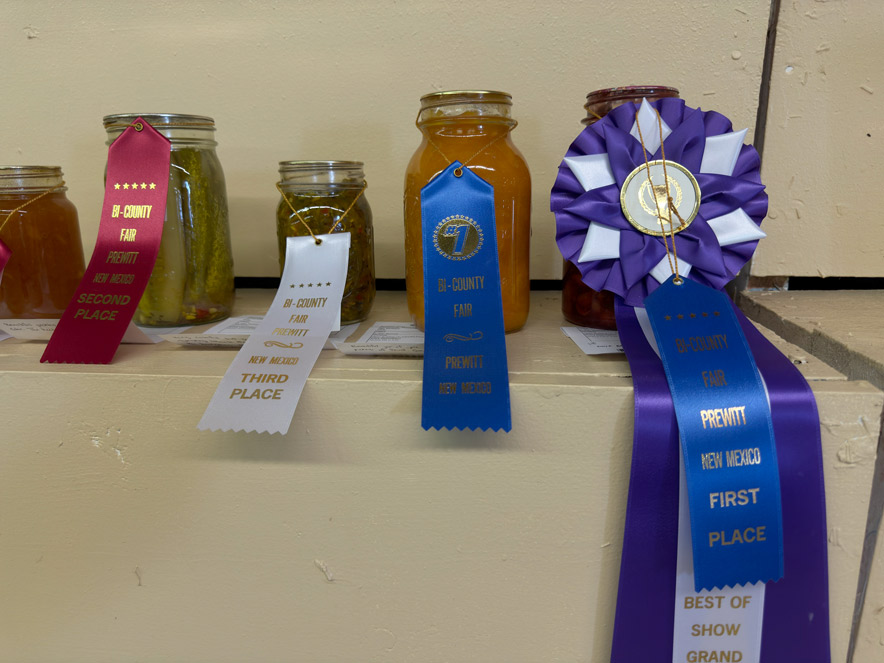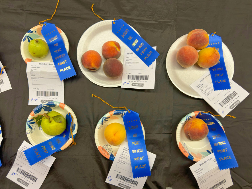 Fair ribbons hang on horticulture products, such as D’Anjou and Williams pears and Elberta and J.H. Hale peaches, at the 55th Annual Bi-County Fair in Prewitt, N.M., on Aug. 31.