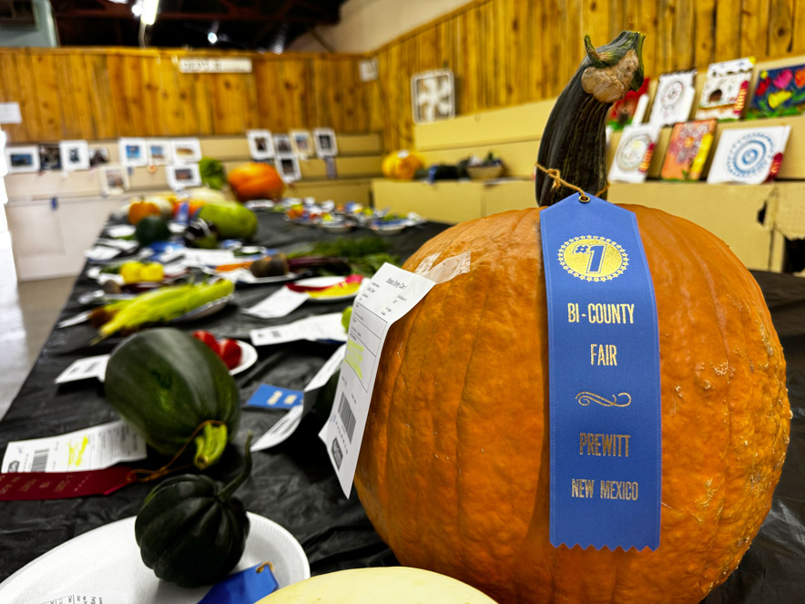 A blue fair ribbon hangs on a horticulture product at the 55th Annual Bi-County Fair in Prewitt, N.M., on Aug. 31.