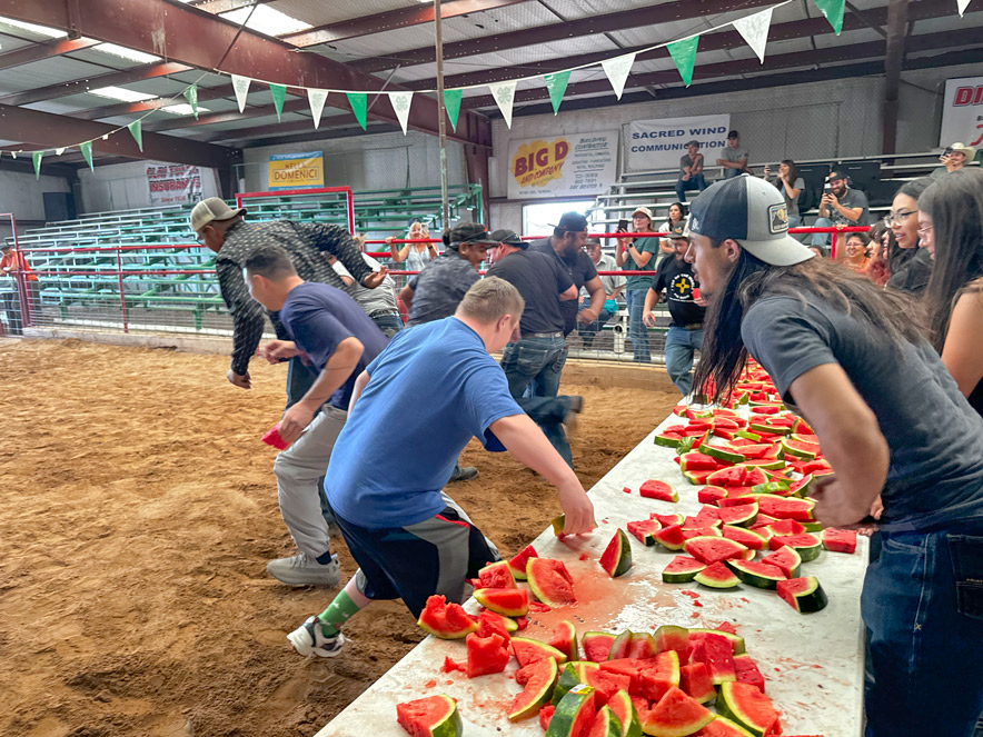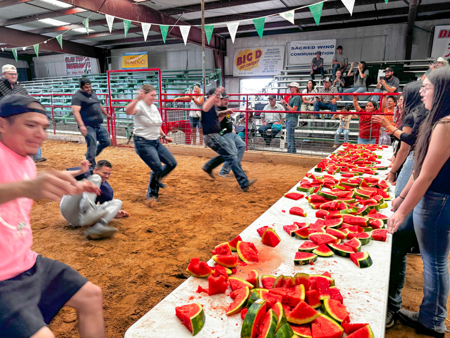 People participate in a watermelon-eating contest at the 55th Annual Bi-County Fair in Prewitt, N.M., on Aug. 31.