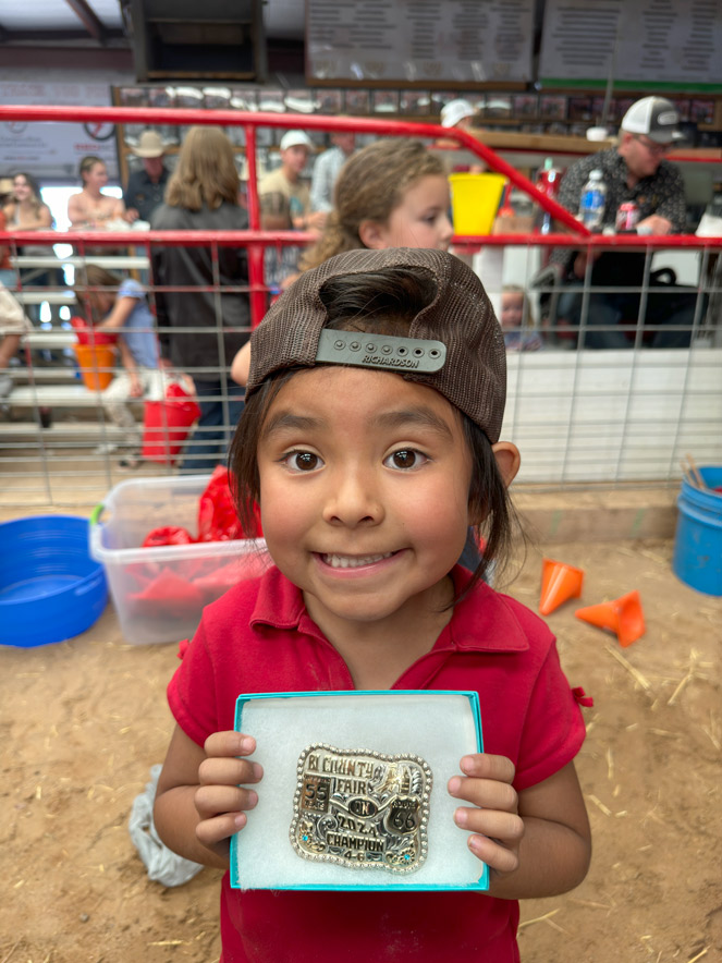 Shelbie Martinez, right, is awarded for exhibiting the reserve champion market swine during the 55th Annual Bi-County Fair in Prewitt, N.M., on Aug. 31.