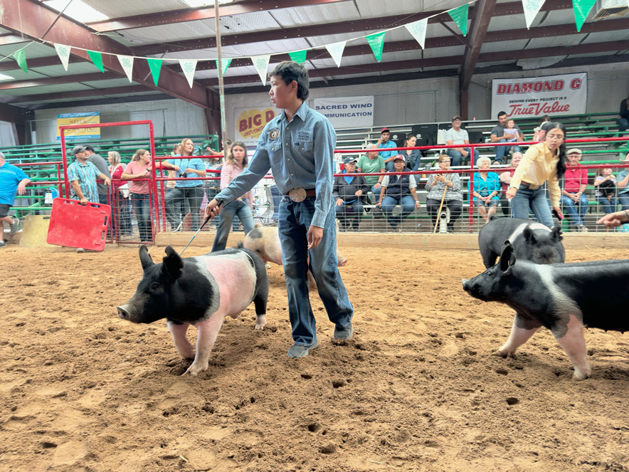 Exhibitors try to make eye contact with the judge as they guide their pigs during the swine showmanship at the 55th Annual Bi-County Fair in Prewitt, N.M., on Aug. 31.