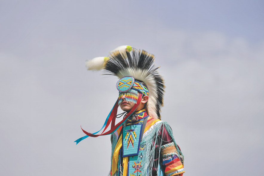A dancer in vibrant regalia stands during the Nizhoni Days Powwow at the University of New Mexico’s Johnson Field in Albuquerque on Sunday, April 26, with beadwork, fringe and a feathered headdress set against the open sky.