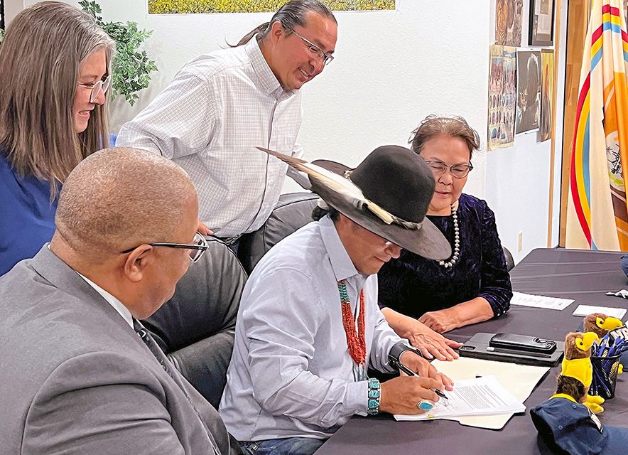 President Buu Nygren signs the Northland Pioneer College lease agreement during a June 30 ceremony at the Kayenta Township Town Hall. Looking on are Township Commission Chair Delores Greyeyes, Town Manager Jarvis Williams, NPC President Von Lawson, and others.
