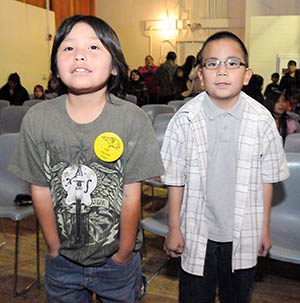 Left, Tahj Naize, 7, of Canyon de Chelly Elementary School, is the second runner-up and Pharrell T. Curtis, 7, of Lukachukai Elementary School, is the champion in the second-grade competition. Curtis won by correctly spelling "declarative."