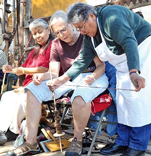 BOTTOM PHOTO: Francis Manuelito, right, of Newcomb, N.M., instructs Joya Banaka, a teacher at Nizhoni Elementary in Shiprock, on how to spin wool. Jessie Deal, of Shiprock, looks on. (Special to the Times - Rick Hoskie)