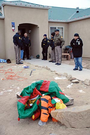 Navajo Nation Police officers stand outside a house that is being vacated by a resident in Church Rock, N.M., on the evening of Dec. 28. Eleven families were evicted.