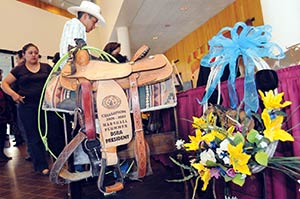 A champion roping saddle belonging to the late Marshall Plummer was on display at the memorial services held at Farmington Civic Center on Monday.
