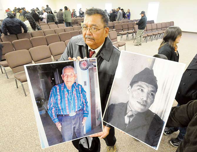 Lawrence Alfred, son of the late Navajo Code Talker Johnny Alfred holds portraits of his father after the funeral Wednesday in Tuba City.