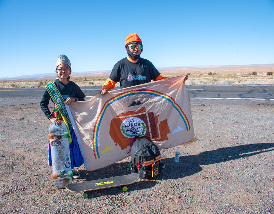 A Navajo Nation flag on his shoulders, he skates the long road toward Shiprock