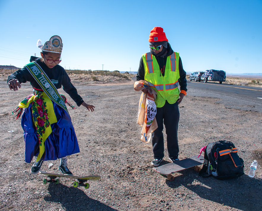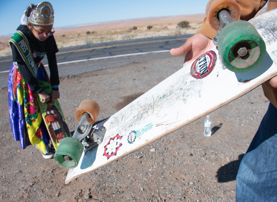 When he finished that crossing, members of the Tuba City Native Language Program Association gave him a replacement skateboard. Someone had run over his first board during the journey. The gesture moved him.