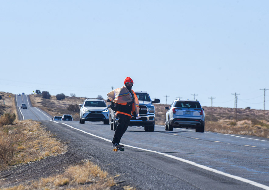 It’s just after 6 a.m., and the 23-year-old has already left Tuba City Chapter behind. Ahead of him stretches miles of open road, the kind that chews up skateboard wheels and tests resolve.