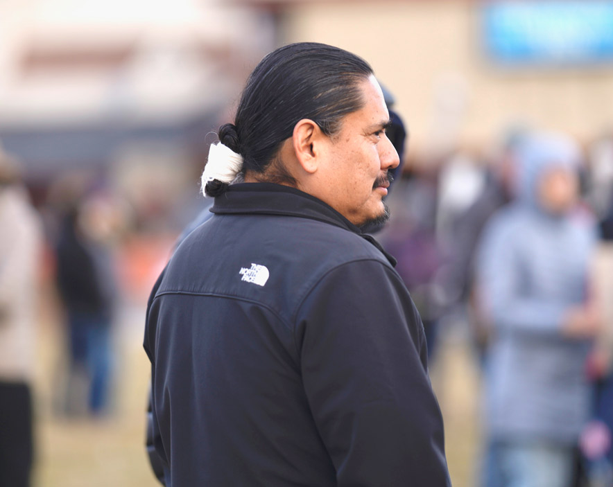 Eric Descheenie, a candidate for Arizona’s 2nd Congressional District, stands among demonstrators during a protest outside Flagstaff City Hall on Saturday, Jan. 3, 2026.