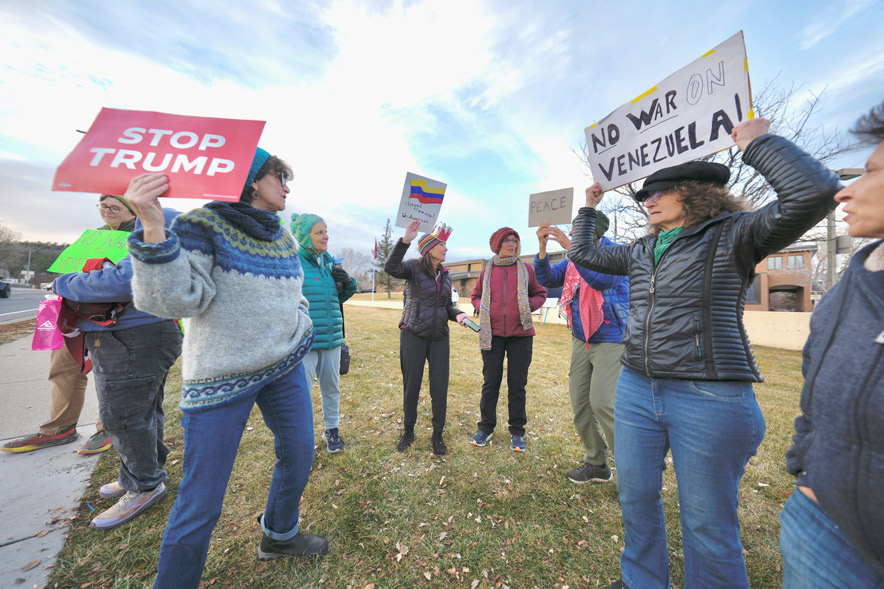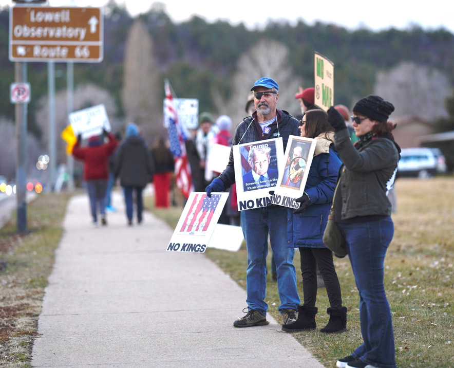 Demonstrators line a sidewalk near Flagstaff City Hall holding signs during a protest on Saturday, Jan. 3, 2026. Participants gathered to voice opposition to U.S. military action in Venezuela.