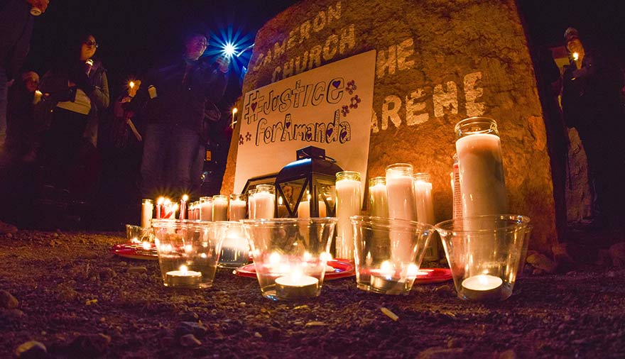 Candles illuminate a “Justice for Amanda” sign at a candlelight vigil for Amanda Dakota Webster, a murdered Cameron community member.