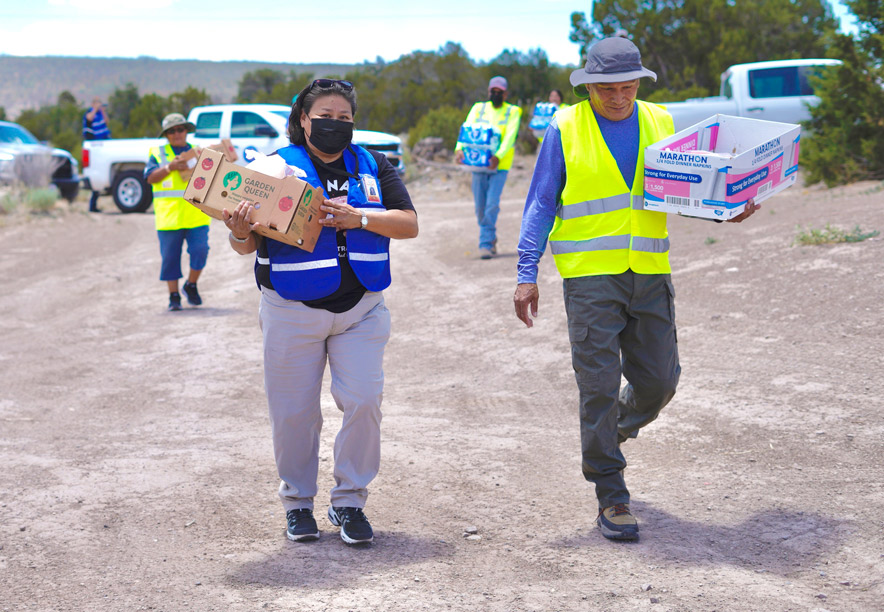 Michele L. Morris of the Navajo Nation Department of Health and Darwin Mitchell of the Navajo Nation Special Diabetes Project carry supplies to residents affected by the Oak Ridge Fire on July 4 in Oak Springs, Ariz.