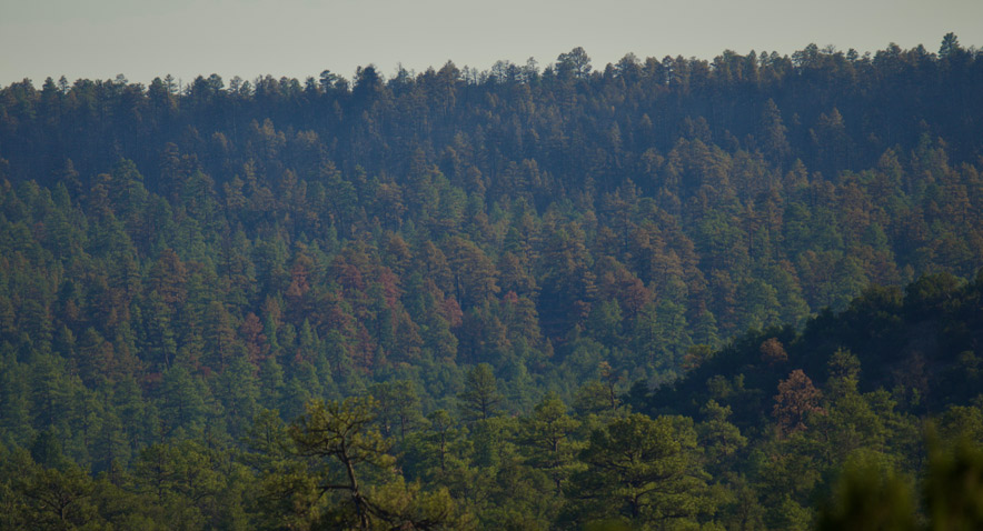 A slight haze lingers over a forest of green and browning trees near the Oak Ridge Fire on July 4, where drought, past bark beetle infestations, and ongoing fire threats continue to reshape the landscape.