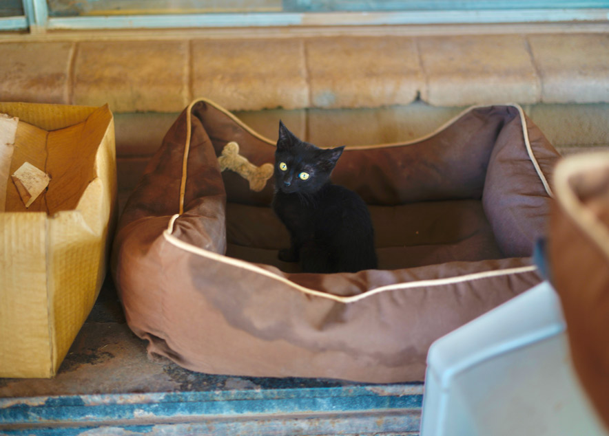 A black kitten sits in a pet bed at a home in Oak Springs, Ariz., where residents visited by Delegate Brenda Jesus on July 4 requested dog and cat food among other essential supplies.