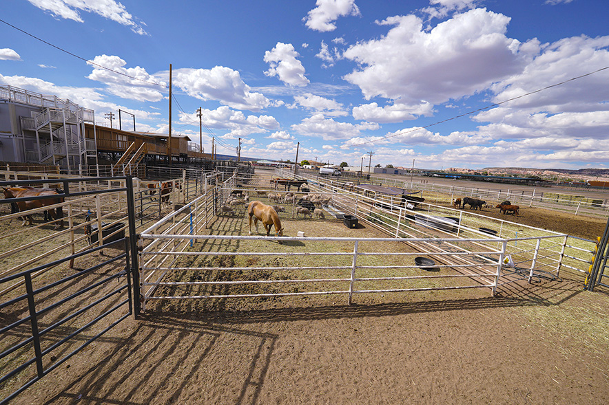 A student with the Office of Diné Youth guides livestock into pens at the Dean C. Jackson Memorial Arena on July 7. The arena served as a temporary shelter for animals evacuated during the Oak Ridge Fire.