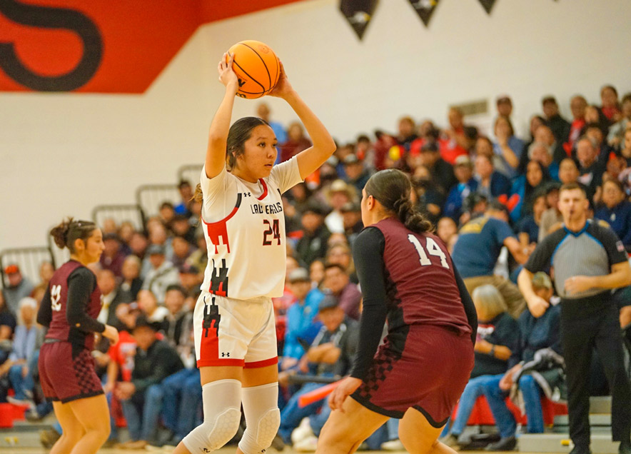 Crownpoint senior Courtney Craig (24) gets set to pass the ball while being defended by Tularosa’s Kiah Zysk (14) during Friday’s opening round of the New Mexico Class 3A girls state playoffs. Craig finished with a game-best 22 points, helping the Lady Eagles to a 52-39 win.