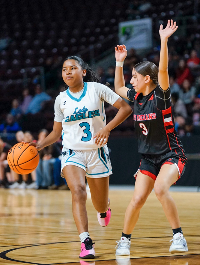 Navajo Prep freshman point guard Dejahnelle Denetso (left) keeps her dribble while being defended by Cobre’s Kamera Ortiz during Thursday night’s Class 3A state semifinal game at Rio Rancho Events Center. The top-seeded Lady Eagles will play No. 2 Santa Fe Indian School in Friday’s final at the Pit in Albuquerque.