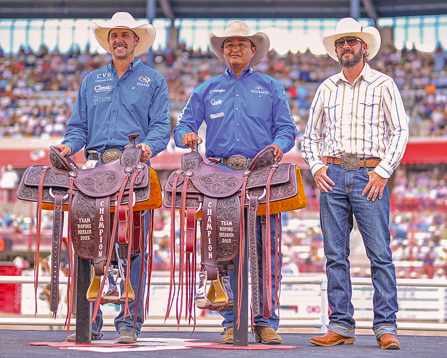 Jeremy Buhler (left) and Aaron Tsinigine (middle) won the Cheyenne Frontier Days rodeo on Sunday afternoon with a 9.3 run in the team roping.