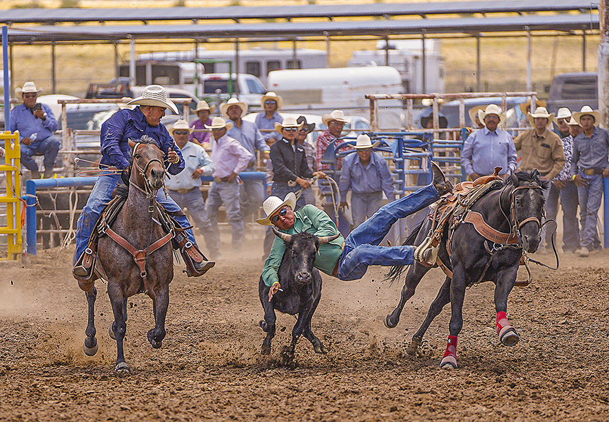 Brandon Bates jumps for his steer during the Eastern Navajo Fair Rodeo. Bates posted a 5.31 run and earned the average title on Sunday afternoon.