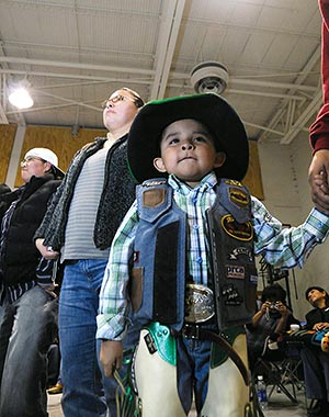 Wooly rider Jaron Yazzie, 5, of Farmington, joins the round dance Saturday night in Shiprock. Yazzie is competing this week at the Ft. Worth Stock Show and Rodeo in Ft. Worth, Texas.