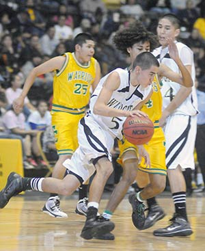Chinle's Koyai Clauschee (5) drives around Tuba City's Alex Goldtooth Jan. 29 at the Wildcat Den in Chinle. The Chinle Wildcats defeated the Tuba City Warriors, 72-52.