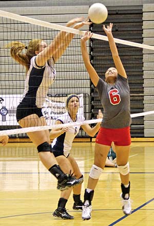 Piedra Vista’s Haleigh Lovato (left) blocks Monument Valley’s Nekiyah Draper (6) during the championship match of Piedra Vista’s Panther Classic held Sept. 12-13. The Lady Mustangs defeated the Lady Panthers 3-0 for the tournament title. (Times photo – Sunnie R. Clahchischiligi)