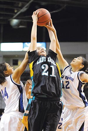 Navajo Prep's Heather Rogers (21) grabs the ball over Navajo Pine's Cinandre Dolfin (12) and Destiny Laughlin (44) Tuesday morning at the Santa Ana Star Center. Navajo Pine defeated Navajo Prep, 56-55, in the quarterfinals of the Class 2A state tournament.