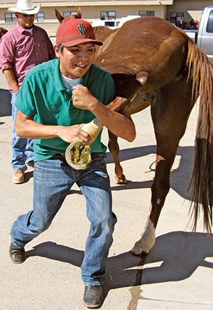 Outside, 17-year-old Will Tuni demonstrates his specialty. Someone has brought in a sorrel mare with a limp.