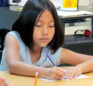Third-grade student Tykeirah Apachito works on a Navajo language