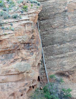 An aged log stands against the wall of Fortress Rock in Canyon del Muerto in Canyon de Chelley National Park. Foot and hand holes were carved into the rock next to the pole.