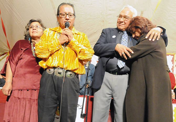 Earl Tulley speaks to supporters with his wife, Leila Help-Tulley at his side as president candidate Lynda Lovejoy is comforted by her husband Tuesday night at their campaign tent in Window Rock.