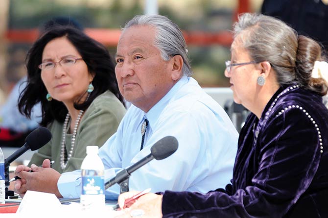 Navajo Nation Supreme Court Chief Justice Herb Yazzie, center, and Associate Justice Louise G. Grant, left, look on as Associate Justice Eleanor Shirley, right, interprets their decisions into Navajo on May 28 at Veterans Memorial Park in Window Rock.