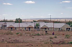In front of a new housing development, a shepherd takes a break. Tohatchi's ranching economy has been largely replaced by jobs in nearby Gallup.