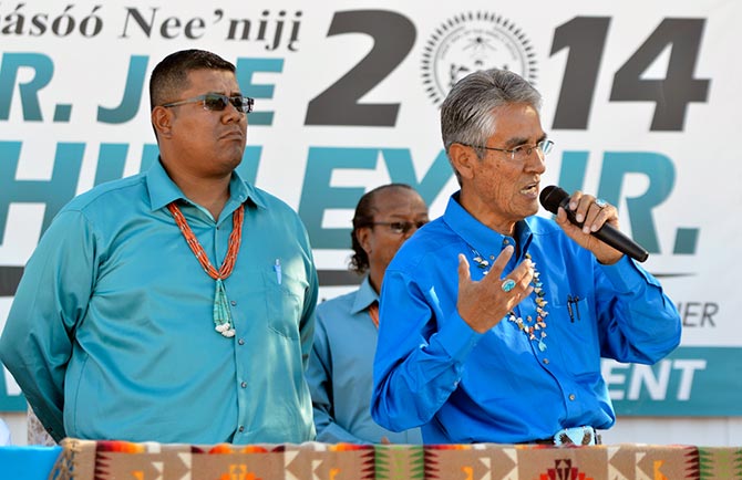 Navajo Nation Presidential candidate Joe Shirley Jr announces his vice-presidential candidate Dineh Benally at a press conference on Tuesday, Sept. 2, 2014, in Window Rock. Dineh is the son of former Navajo Nation Presidential candidate, Donald Benally.