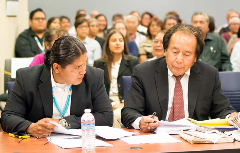 Navajo Nation presidential candidate Chris Deschene, left, preparers for his oral arguments with his attorney Samuel Pete on Friday in Tuba City. Former Navajo Nation presidential candidates Dale Tsosie and Hank Whitethorne filed a motion to disqualify Deschene because he is not fluent in the Navajo language.