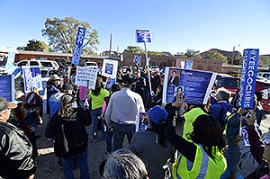 MIDDLE: Navajo Nation presidential candidate Chris Deschene, center, speaks to his supporters who marched through Window Rock to show their support on Friday morning outside the Office of Hearings and Appeals in Window Rock. Deschene's critics have argued that he is not fluent in the Navajo language, therefore, not qualified.