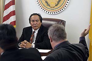 TOP: Chief hearing officer with the Office of Hearings and Appeals, Richie Nez, listens to attorney for Dale E. Tsosie, David Jordan speak at the hearing for Navajo Nation presidential candidate Chris Deschene is fluent enough in the Navajo language on Friday in Window Rock.