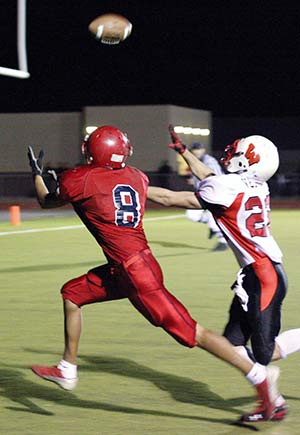 Red Mesa receiver Dustin Sagg beats Wilcox defender Rudy Verduggo for a touchdown in the third quarter of their Arizona 2A conference playoff game on Friday, Nov. 6, at Red Mesa, Ariz.