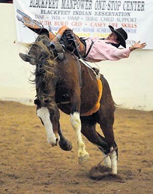 Bennie Begay, of Rock Point, Ariz., scores a 73 in the bareback-riding event at the 35th annual Indian National Finals Rodeo.