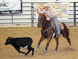 Yolanda Nez, of Kirtland, N.M., ropes for a time of 3.67 seconds in the breakaway-roping event at the 35th annual Indian National Finals Rodeo. Nez won the breakaway world title.
